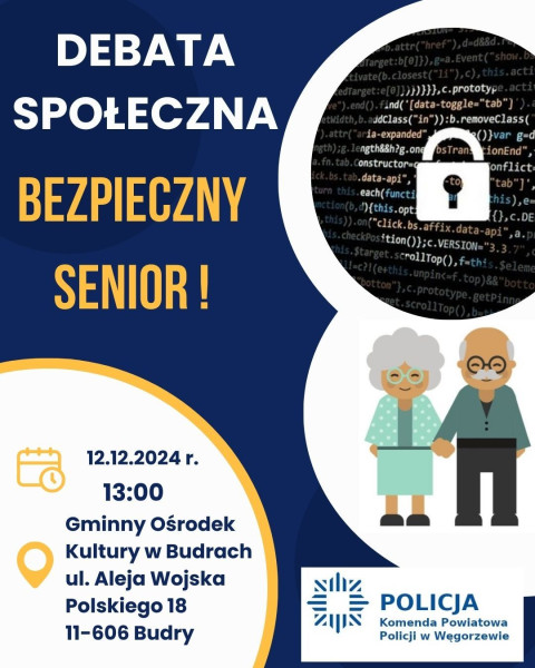 Komenda Powiatowa Policji w Węgorzewie oraz Gminny Ośrodek Pomocy Społecznej w Budrach zapraszają seniorów Gminy Budry na debatę „Bezpieczny senior”, która odbędzie się w dniu 12 grudnia 2024r o godzinie 13.00 na sali widowiskowej w Gminnym Ośrodku Kultury w Budrach.
